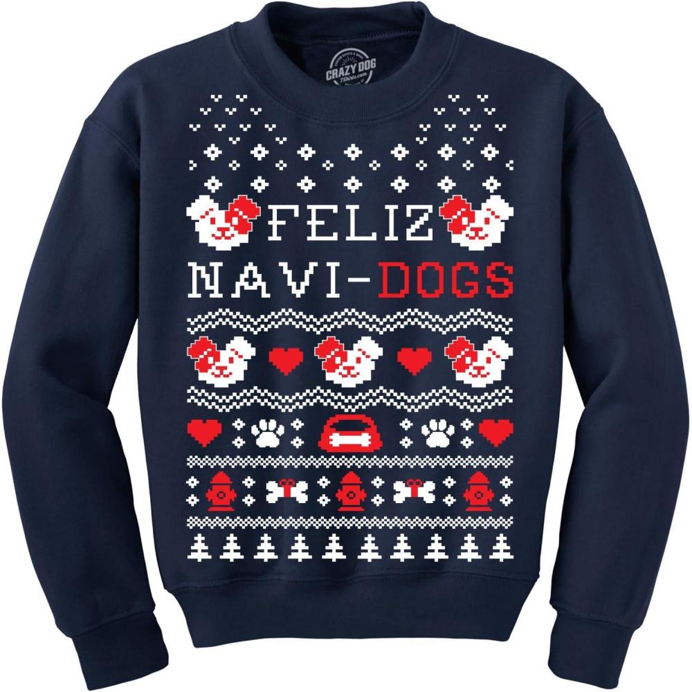 Crazy Dog T-Shirts Crew Neck Sweatshirt Feliz Navi Dogs Funny Holiday Christmas Ugly Sweater Animal Lover(Navy)