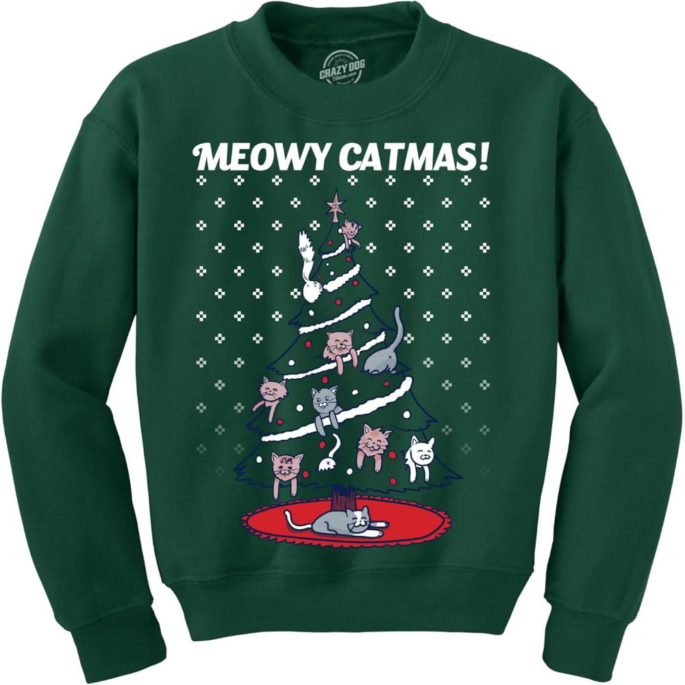Crazy Dog T-Shirts Meowy Catmas Funny Christmas Cat Shirt Novelty Holiday Sweatshirt Graphic Cool(Forest Green)