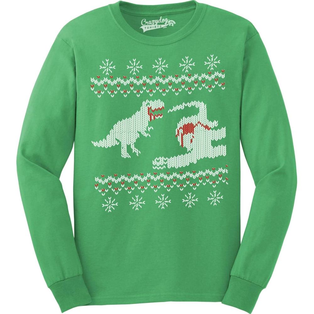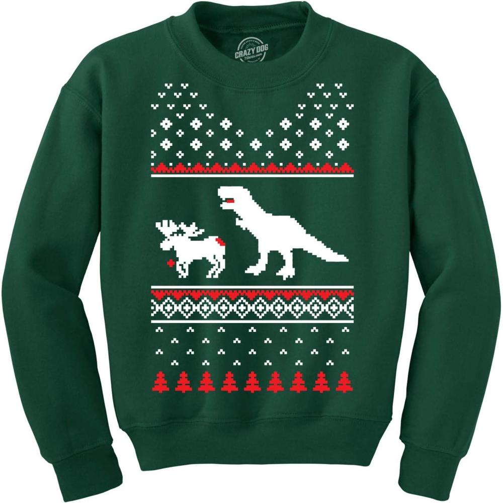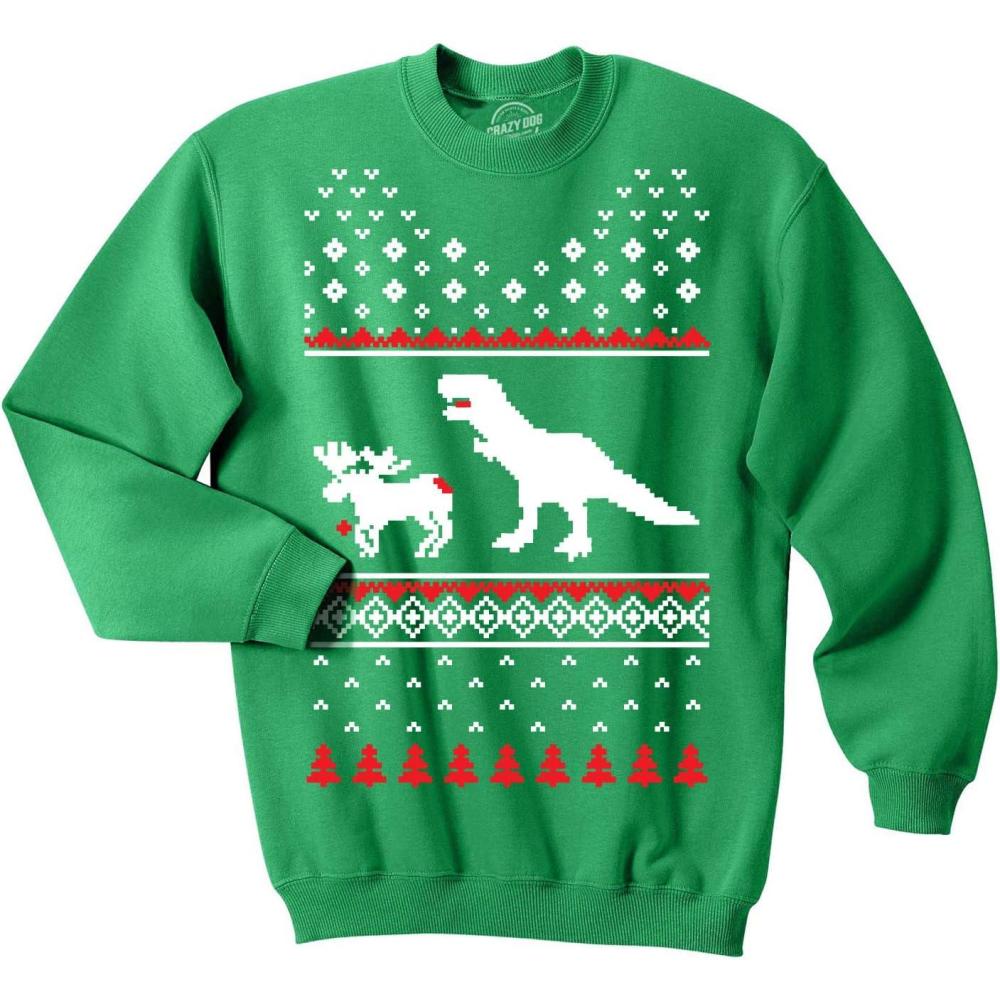 Crazy Dog T-Shirts T-Rex Attacking Moose Christmas Ugly Sweater Funny Holiday Hilarious Adult Humor(Green)