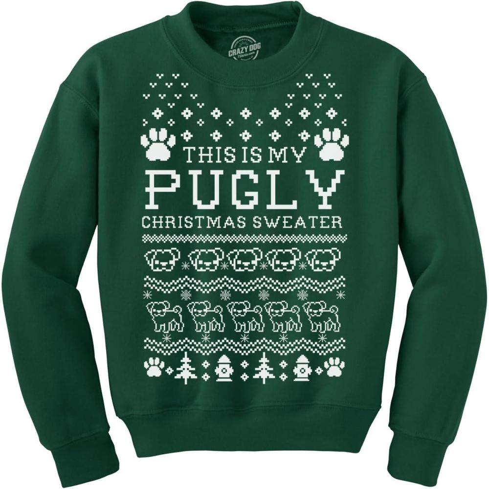 Funny Dog Christmas Sweatshirt – This Is My Pugly Christmas Sweater – Green Crewneck with Pug Graphic and Holiday Icons – Cozy Ugly Holiday Sweater for Dog Lovers – Forest Green L(Forest Green)